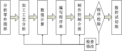 是一个使用计算机辅助编制数控加工程序的过程。编程人员根据零件的设计要求和现有工艺,利用自动编程软件生成刀位数据文件,再进行后置处理,生成加工程序,通过通讯接口或程序纸带,键盘,软盘等介质,将加工程序输出至数控机床执行加工。